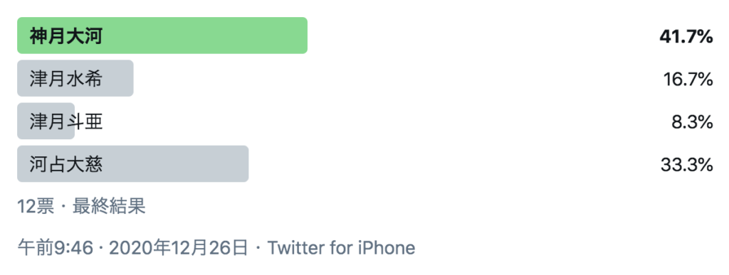 じつは、くるみさんのブログ記事を読んで「自分の五行に無い星を補う」というアドバイスにしたがって、持っていない水の五行を補う名前案を考えて、Twitterのフォロワーさんにアンケートを実施したんです。