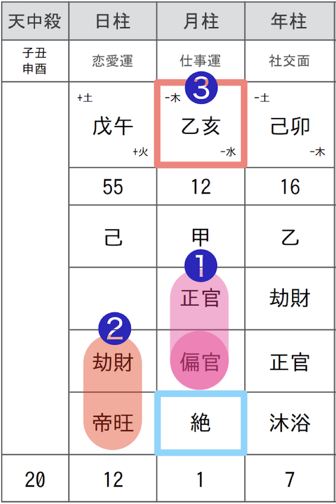 信号機にたとえれば、常に青信号だと思ってグングン前へ進もうとしている状態(偏官)であるのに、赤や黄色の信号をちらついているため(絶)、【偏官】の性質がスムーズに発揮できない状態です。