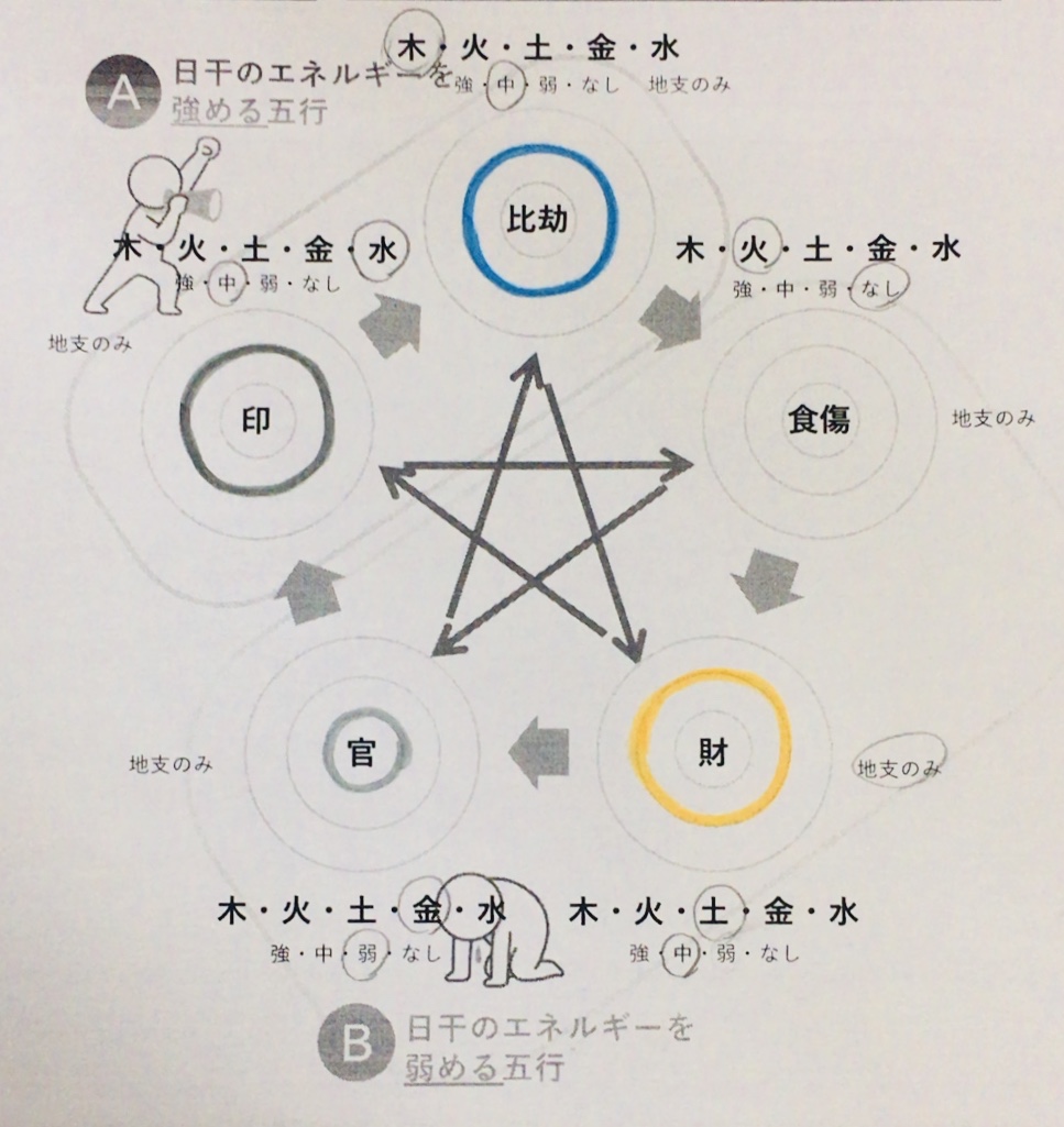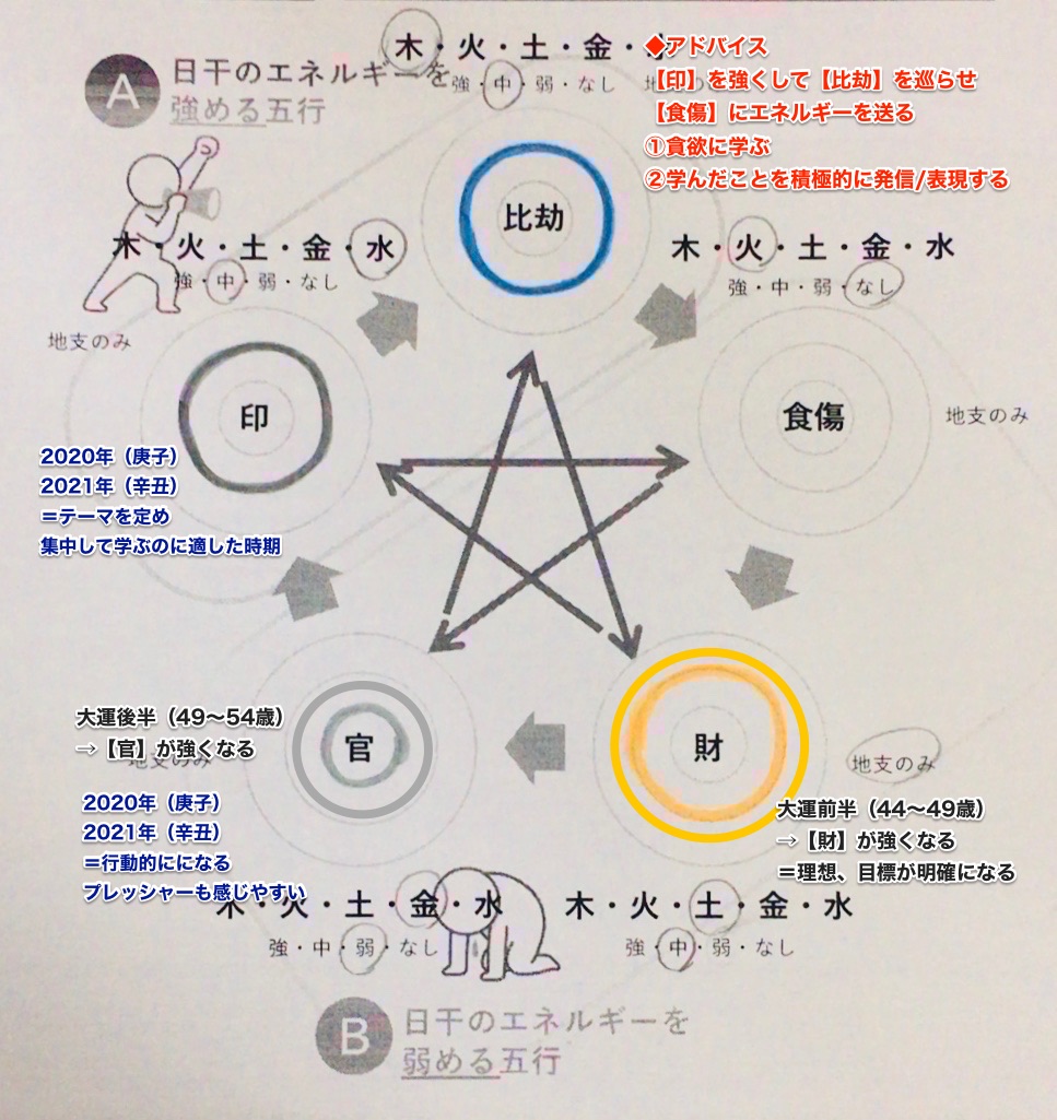 - どんどん学んで自分自身を鍛え、学んだことを積極的にアウトプットすることで、もともと星がない【食傷】にエネルギーが巡る