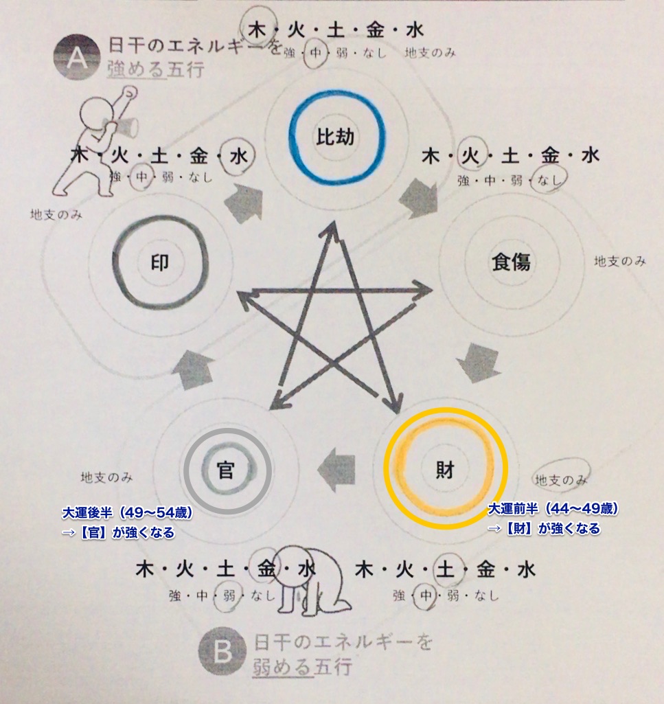 44歳〜(前半)は「土」の五行が巡るため、やまちゃんの【財】の星に影響が出ます。