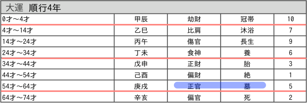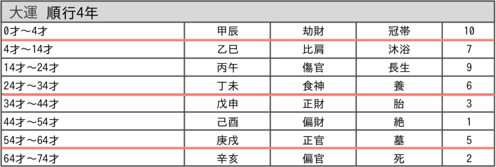10年周期の社会運を示す大運は、前半の5年間は天干で、後半の5年間は地支で読みます。