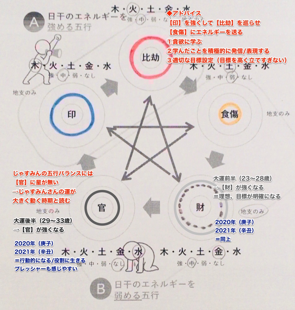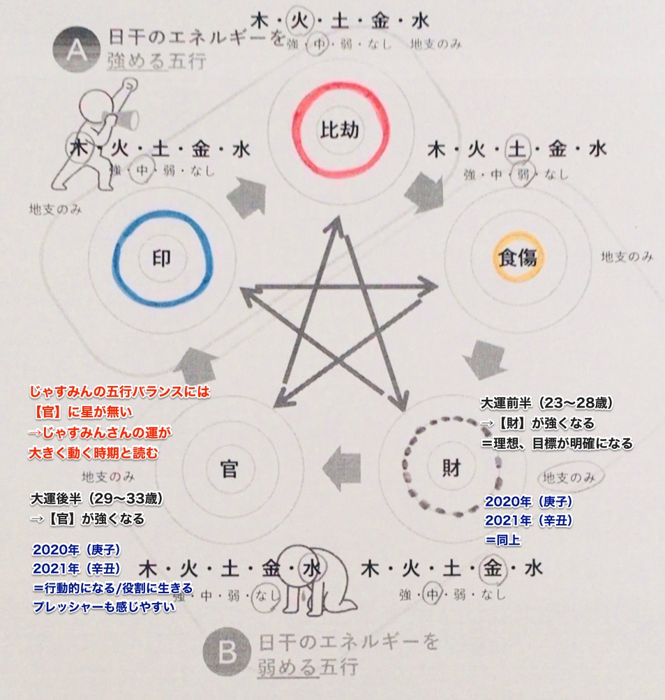 - じゃすみんさんの五行バランスは【官(水の五行)】が弱い。ここに「水」の五行の年干支(庚子 / 辛丑 / 壬寅 / 癸卯)ががめぐるため
