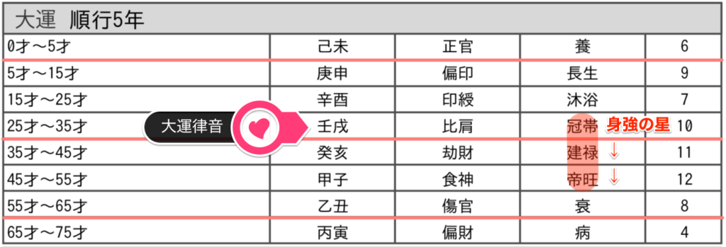 大運律音とは、ゆうりさん自身を表す日柱の干支【壬戌】が、大運にも巡る状態のこと。
