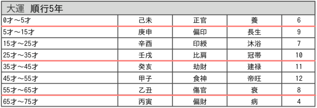 10年周期の社会運を示す大運は、前半の5年間は天干で、後半の5年間は地支で読みます。