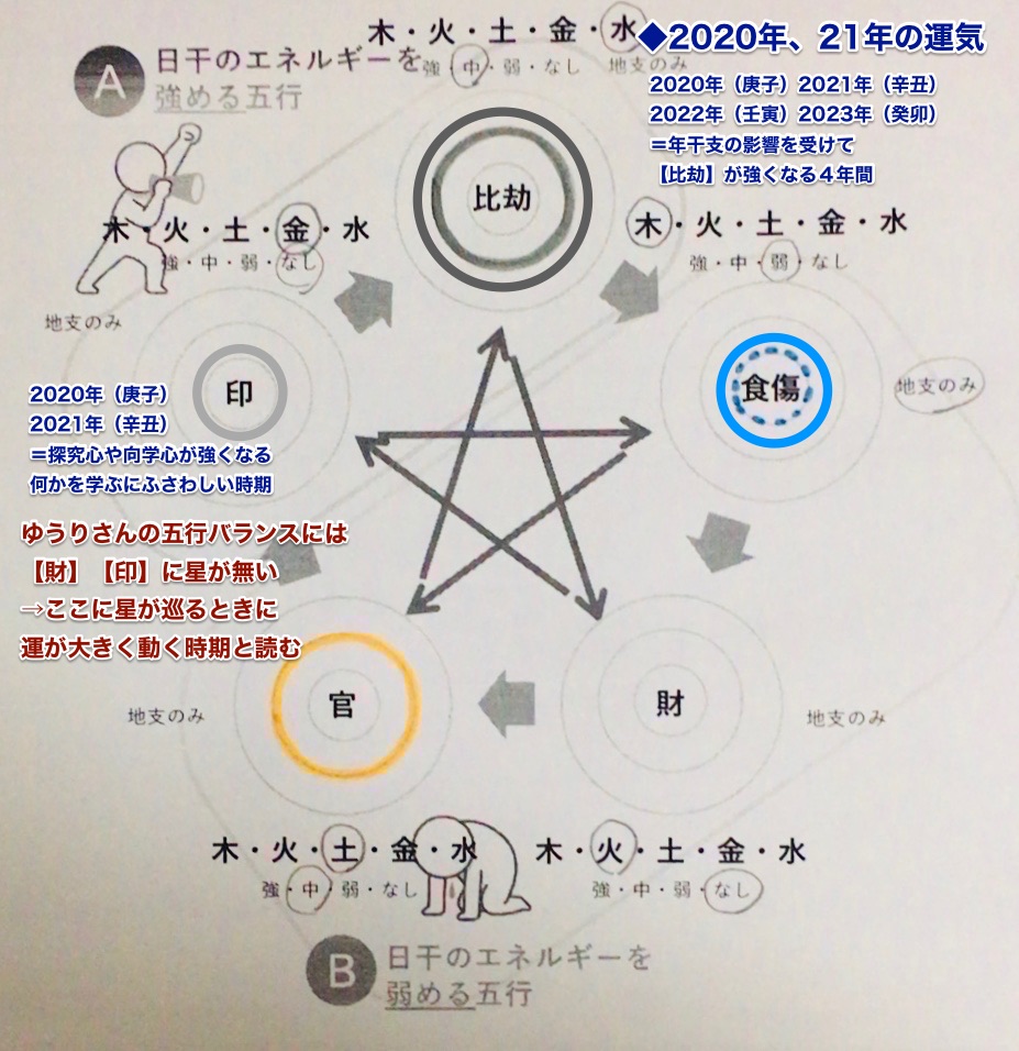 - ゆうりさんの五行バランスは【印(金の五行)】に星がない。ここに「金と水」の五行の年干支(庚子 / 辛丑)ががめぐるため