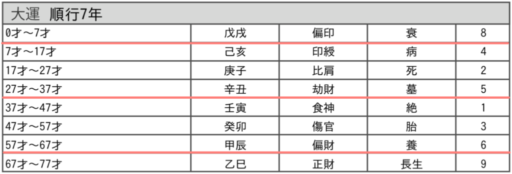 10年周期の社会運を示す大運は、前半の5年間は天干で、後半の5年間は地支で読みます。