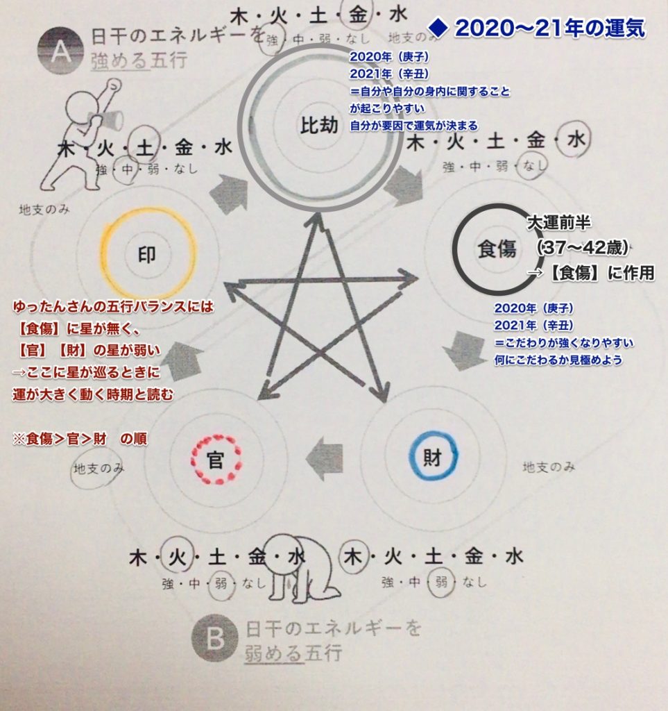 - ゆったんさんの五行バランスは【食傷(水の五行)】が弱い。ここに「金と水」の五行の年干支(庚子 / 辛丑)ががめぐるため