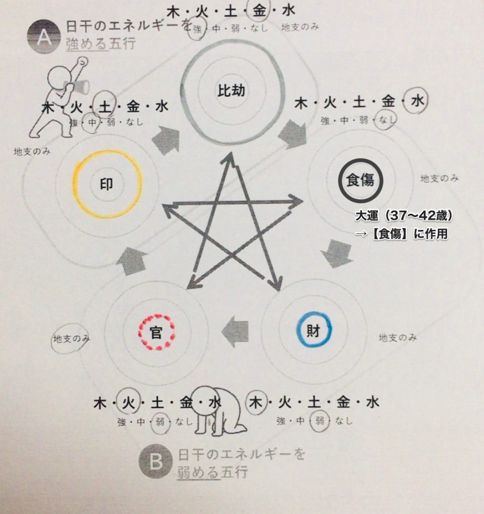 つまり、ゆったんさんの37歳〜42歳前後の5年間は、水の五行(食傷)に作用が出ます。