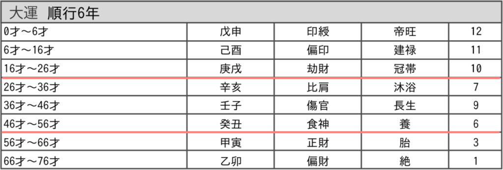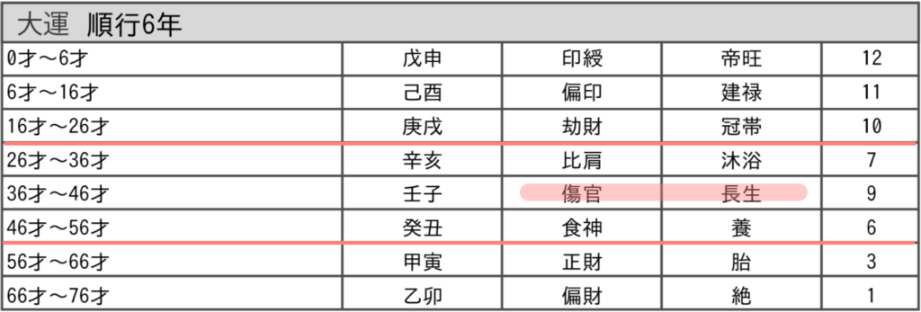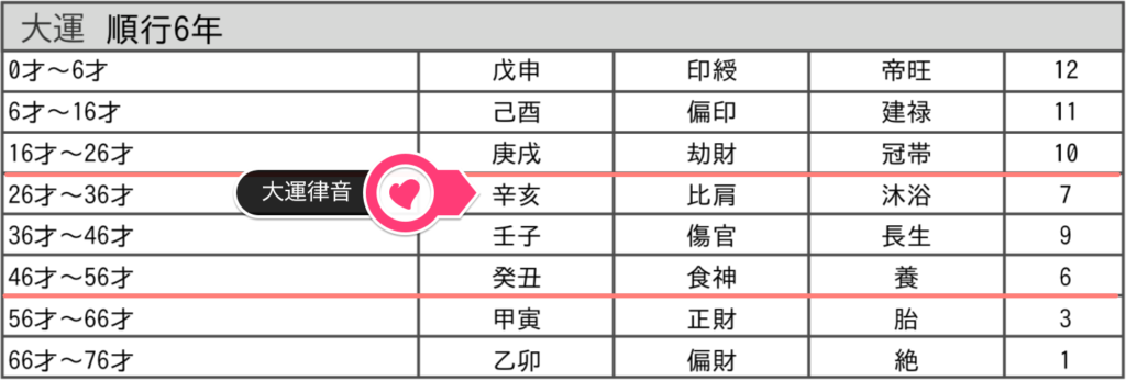 ちなみに、26歳〜36歳の10年間の大運干支は【辛亥】。