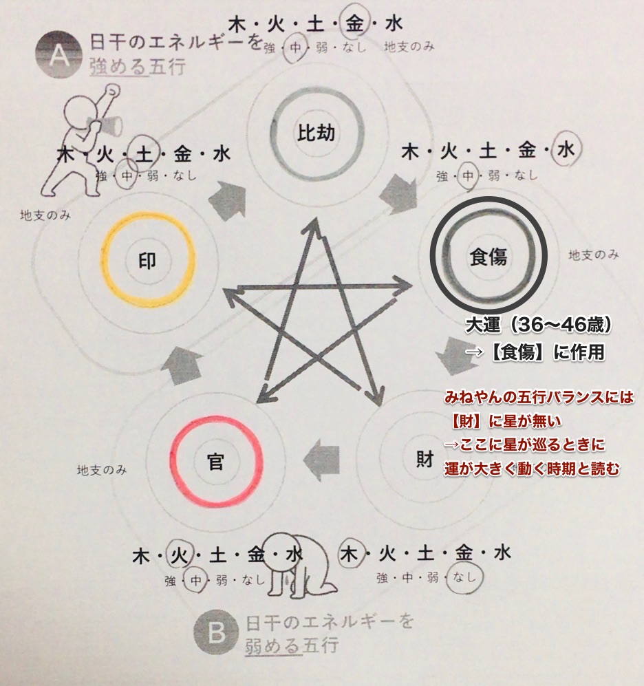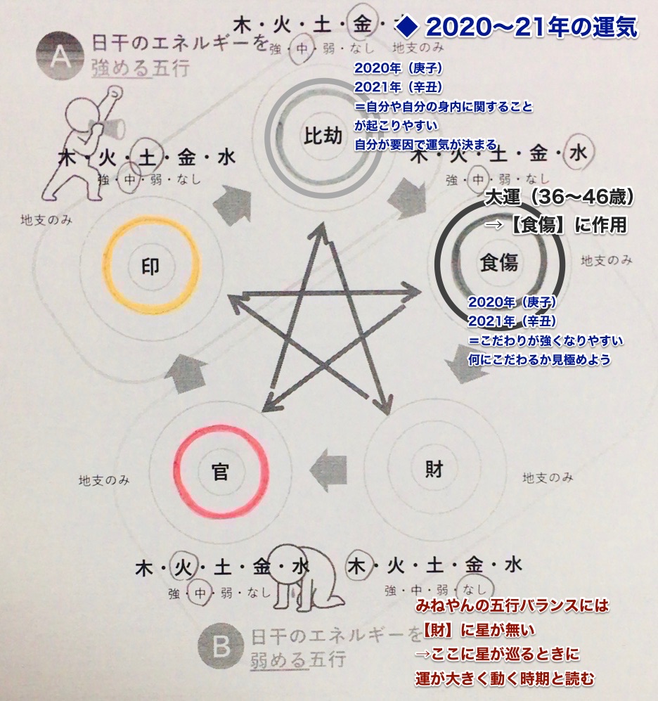 この2年間、みねやんさんの五行バランスでは、金の五行【比劫】と、水の五行【食傷】に影響が出ます。