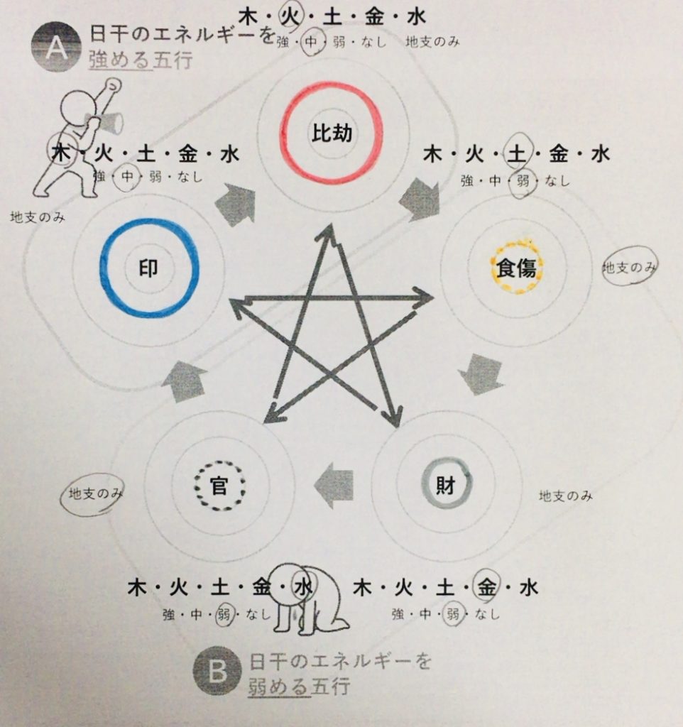 なおさんの五行バランスは、思いや考えを表現することで、弱い【食傷】が刺激されて、なおさんの夢や目標にエネルギーを送る格好です。