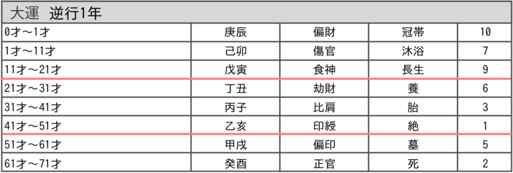 10年周期の社会運を示す大運は、前半の5年間は天干で、後半の5年間は地支で読みます。