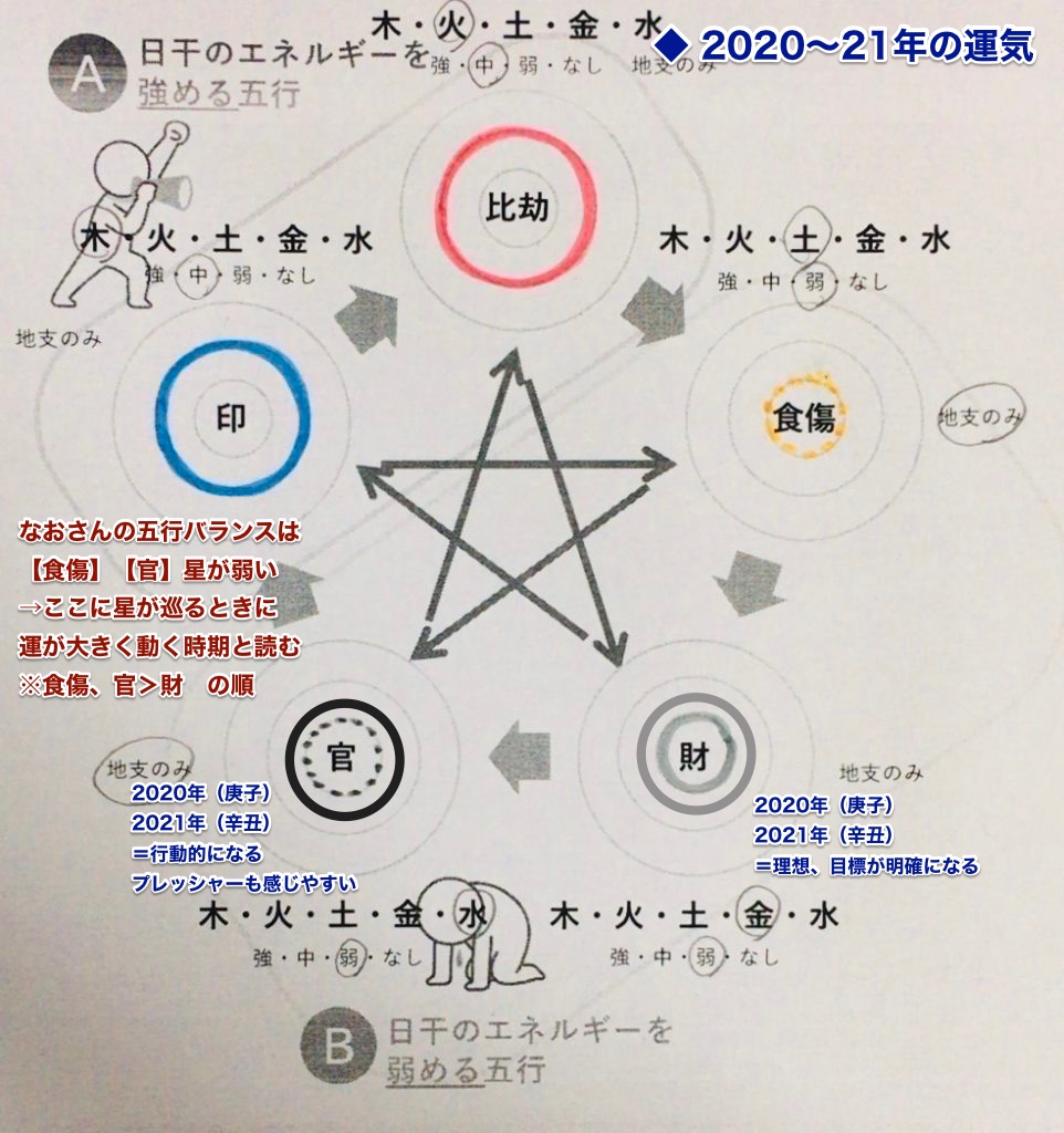 この2年間、なおさんの五行バランスでは、金の五行【財】と、水の五行【官】に影響が出ます。