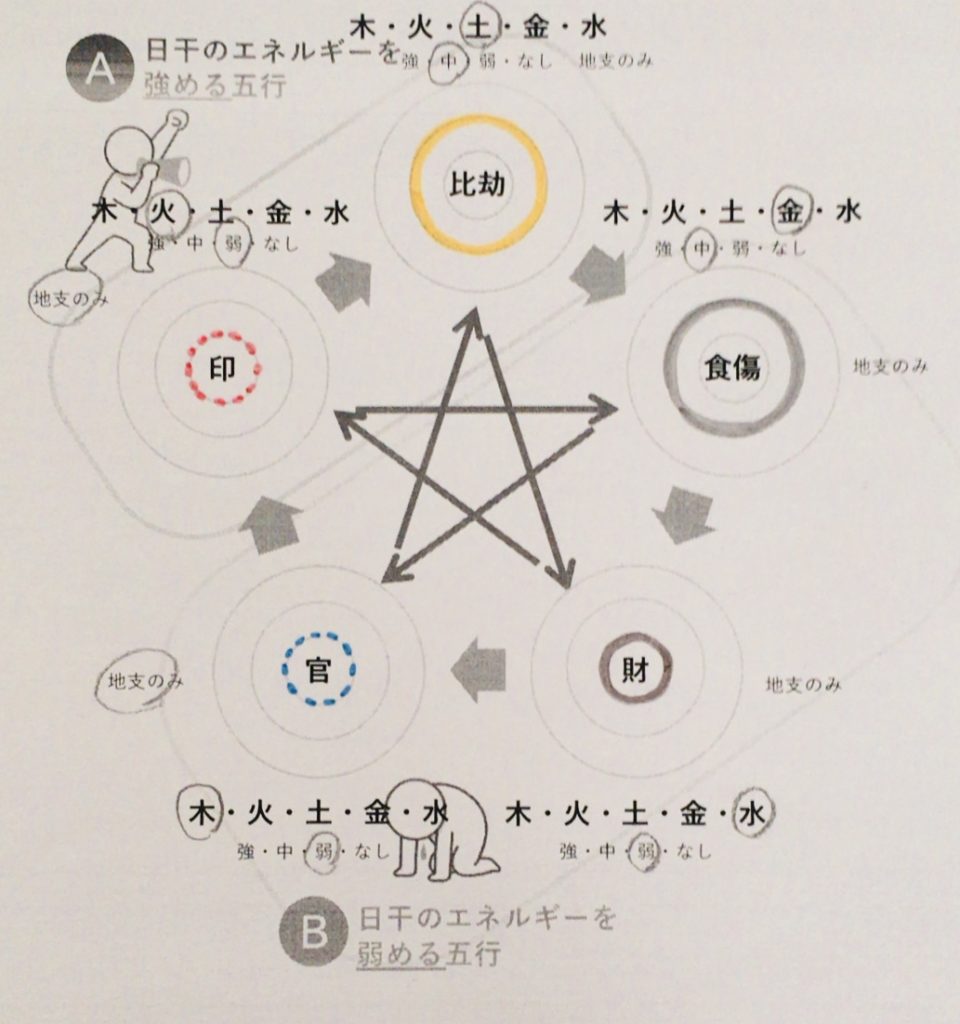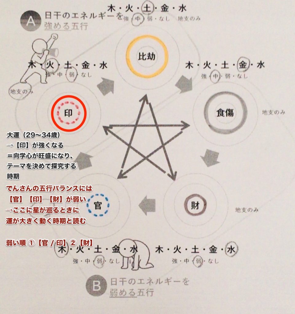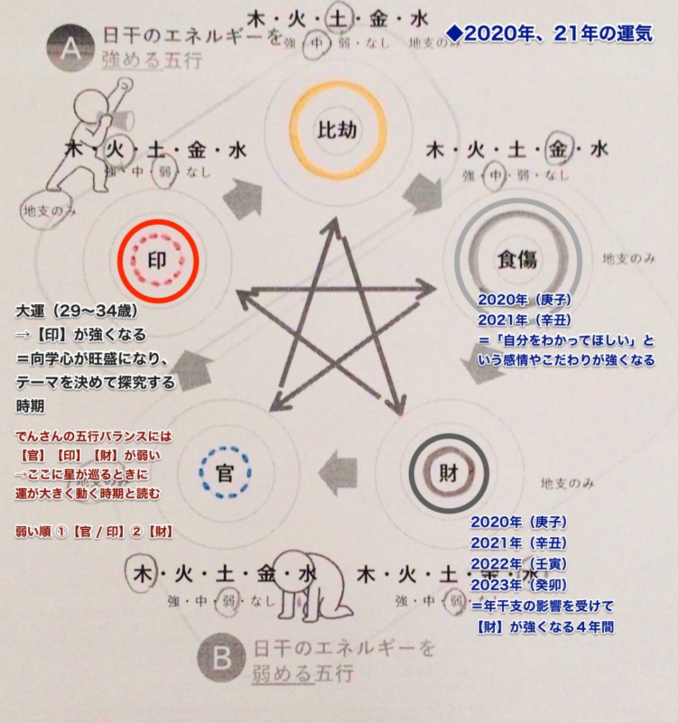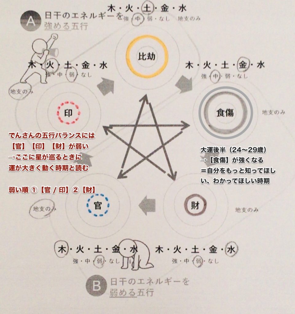 この2年間、でんさんの五行バランスでは、金の五行【食傷】と、水の五行【財】に影響が出ます。