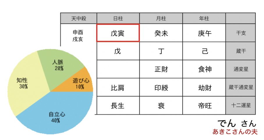 おさらいも兼ねて、でんさんの命式とパラメーター、内面性や大切したい価値観を再度、掲載しておきましょう。