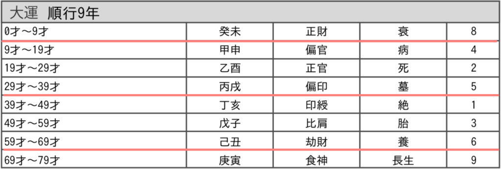 10年周期の社会運を示す大運は、前半の5年間は天干で、後半の5年間は地支で読みます。
