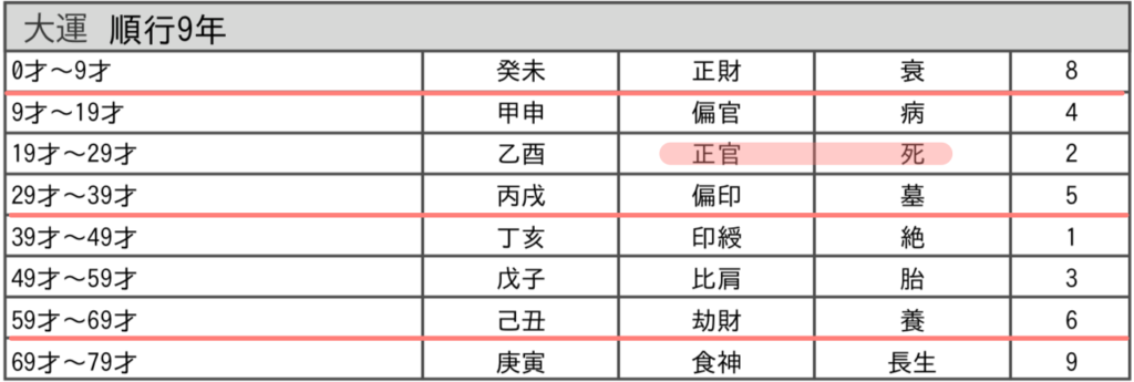 ちなみに以下が、現在のでんさんの大運(24〜29歳)です。
