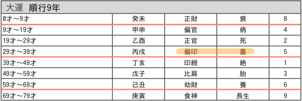 次の大運(29歳前後〜39歳前後)は【偏印 / 墓】。