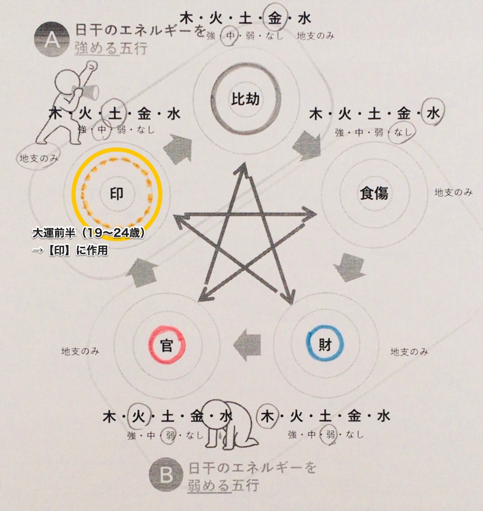 つまり、みゅうさんの次男さんの19歳〜24歳前後の5年間は、土の五行(印)に作用が出ます。