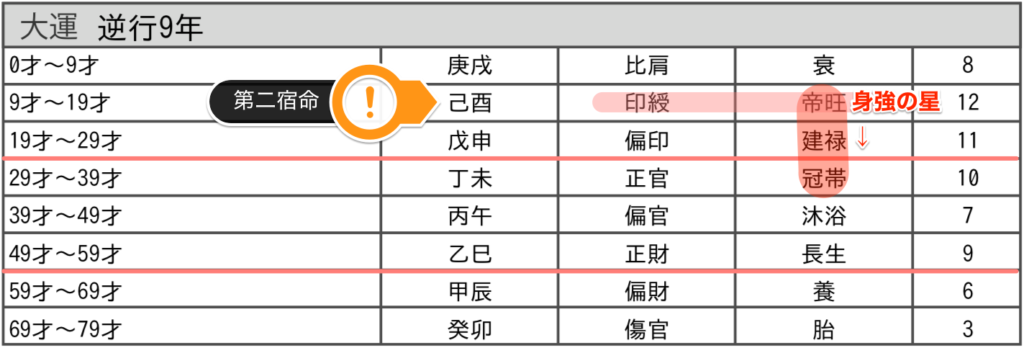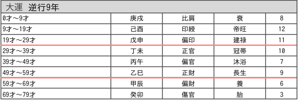 まずは現在の大運について(19〜29歳前後)。