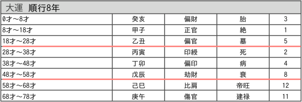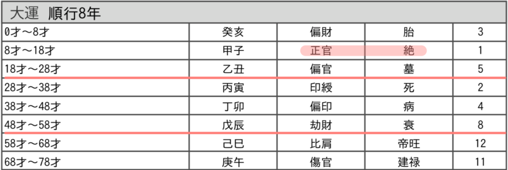 くわえて、13歳前後(2021年〜)から大運は後半に入ります。
