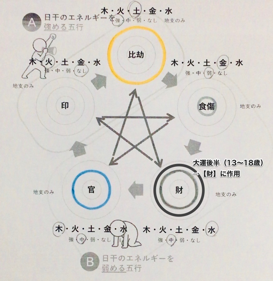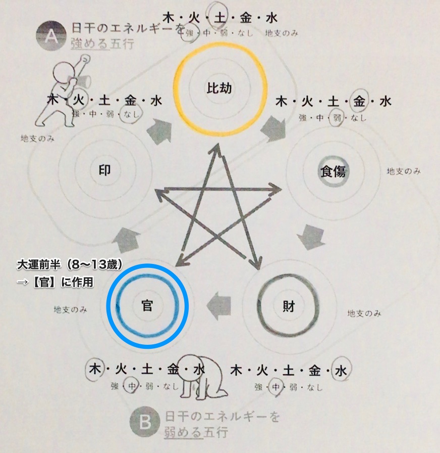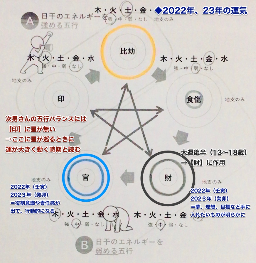 インプット(印)、アウトプット(食傷)を上手に巡らせることで、acoさんの次男さんの五行バランスは巡り出すのです。