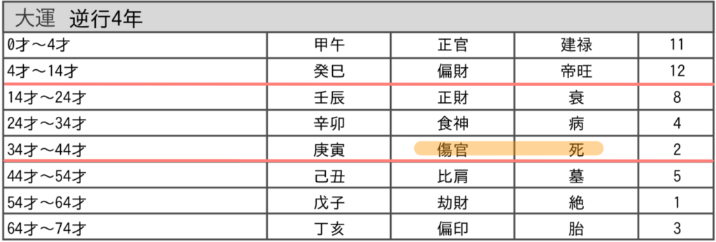 さらに、acoさん自身の現在の大運は【傷官 / 死】(〜44歳の誕生日前後)