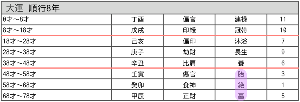 理由は、acoさんの夫の運勢エネルギーを示す十二運星は、48歳以降 胎→絶→墓→(死→病)という無意識や精神性を表す星が巡っているから。