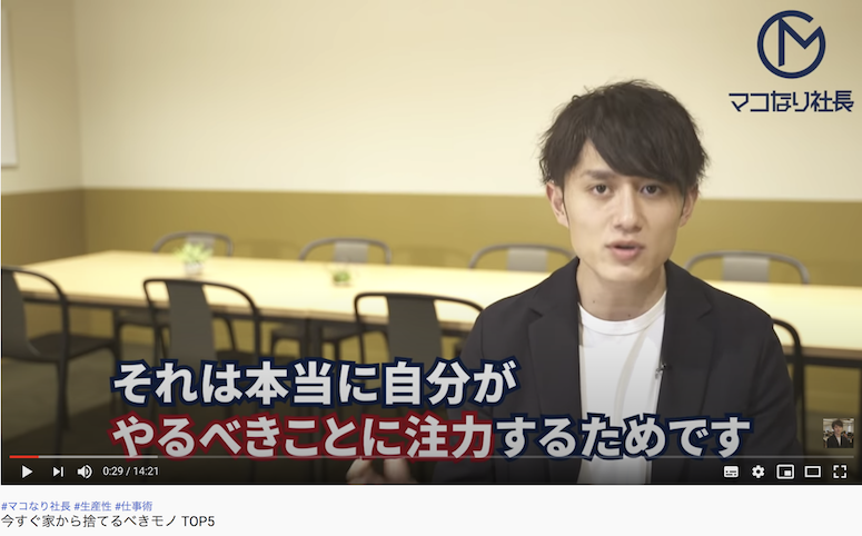 「ものを減らす理由。それは、本当に自分がやるべきことに注力するため」とマコなり社長は話しています。