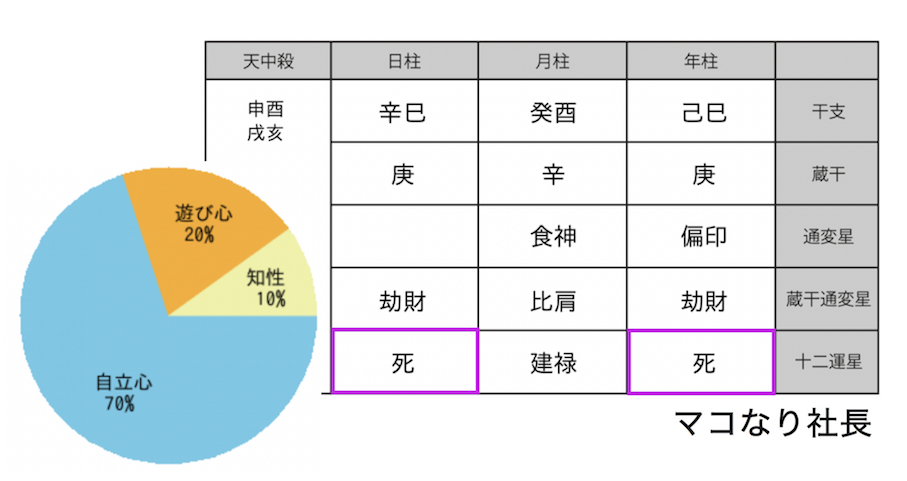 マコなり社長は、何ごとも100%やりぬくことが大前提で、相手の急所を見つけることが得手の十二運星【死】を二つ持っています。