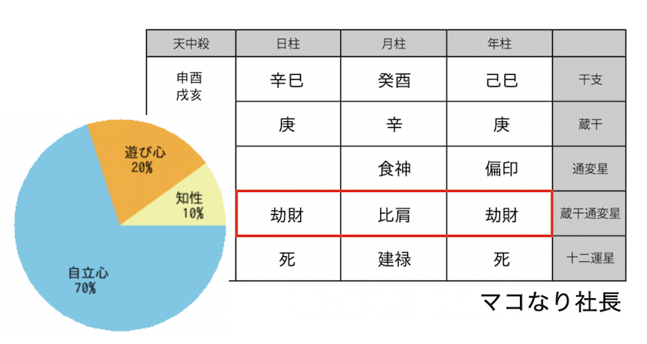 マコなり社長は、命式(以下の表のこと)の月柱にも【比肩】という星を持っています。