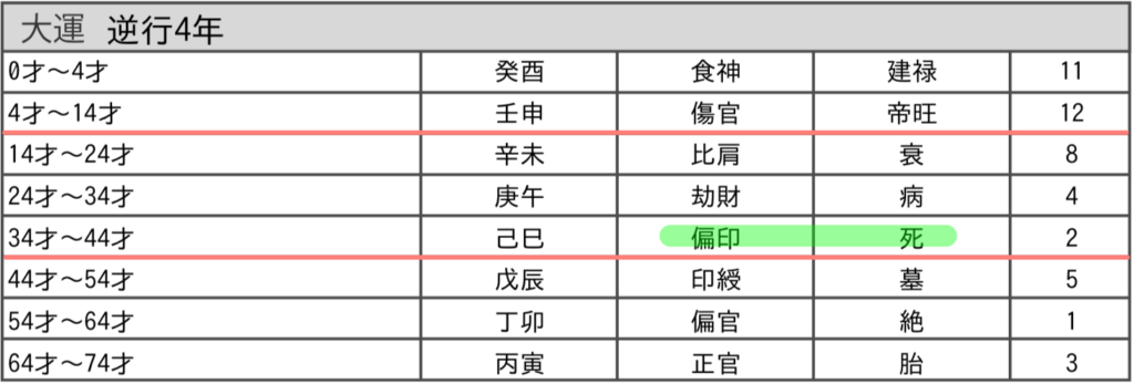 34歳から切り替わる大運は【偏印 / 死】。
