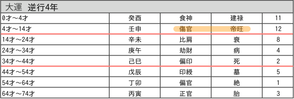 大運【傷官/帝旺】4~14歳