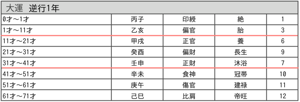 10年周期の社会運を示す大運は、前半の5年間は天干で、後半の5年間は地支で読みます。