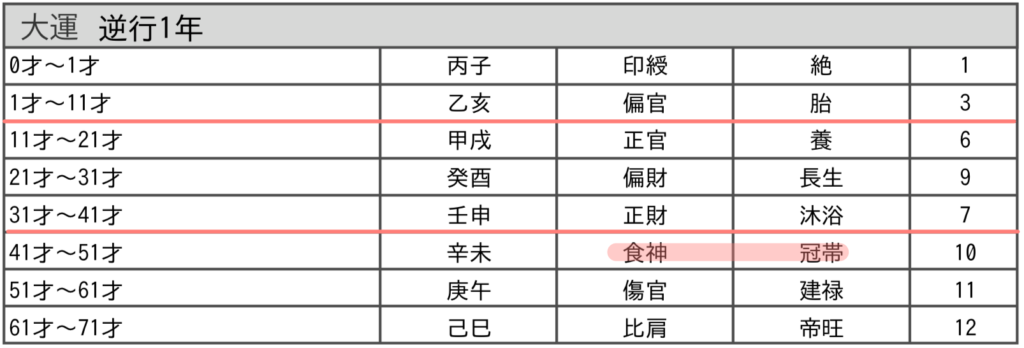 現在の大運【食神 / 冠帯】の星がちゃんと表れていました。
