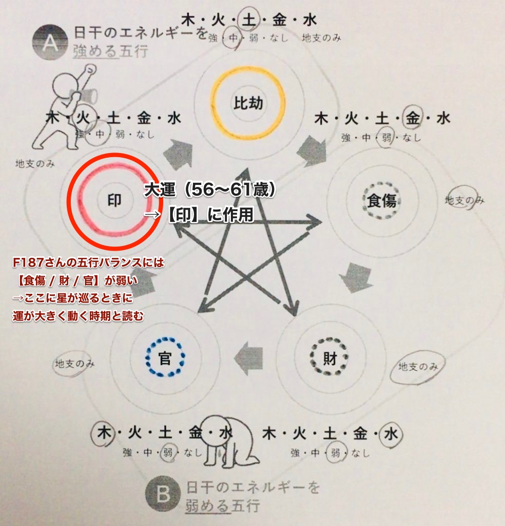 F187さんの大運の後半の5年間は、火の五行(印)に作用が出ます。
