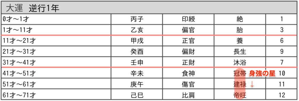 ちなみに、F187さんの場合、30年間続く 身強の星が一番強くなるのは大運【比肩 / 帝旺】の61歳〜71歳です。