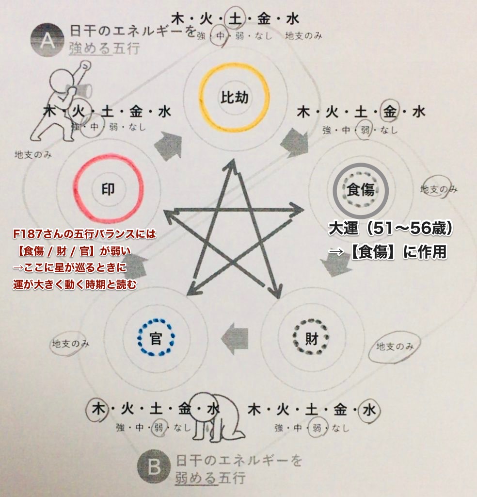 F187さんの五行バランスは、【食傷】【財】【官】の星が弱い、という特長があります。
