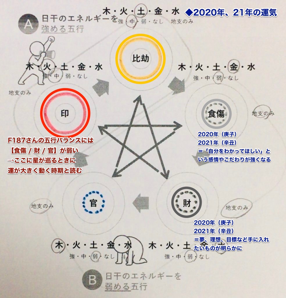 この2年間、F187さんの五行バランスでは、金の五行【食傷】と、水の五行【財】に影響が出ます。