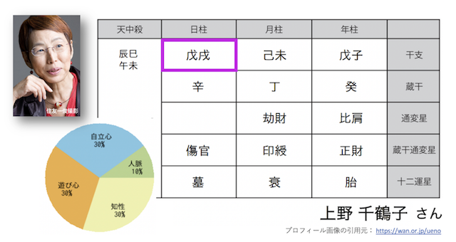 舌鋒の鋭い上野千鶴子さんの華々しいキャリアなど、四柱推命で読んでみました