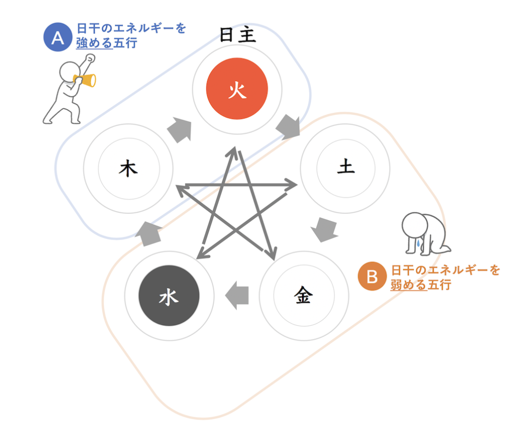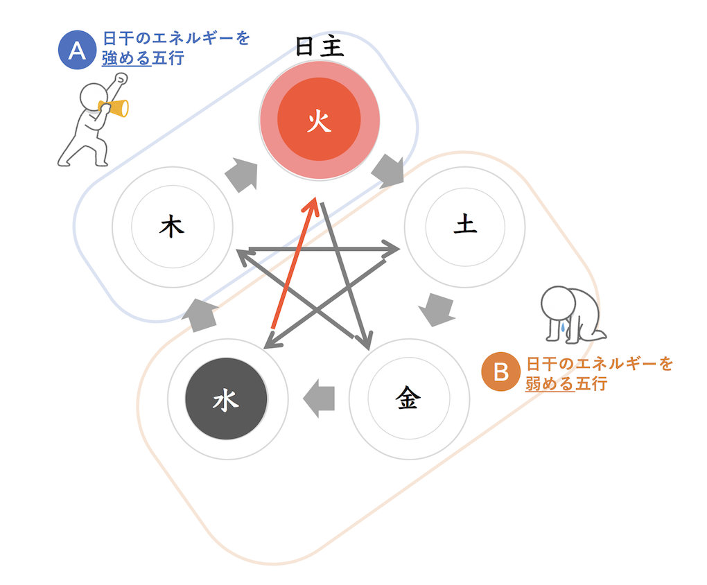 日主:火の五行(丙・丁)の五行バランスを見る図で説明します。