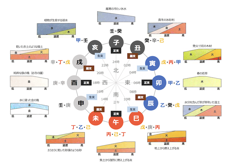 原則として、火の五行は命式の温度を上げる働きをし、いっぽう、水の五行は命式の温度を下げる働きをします。