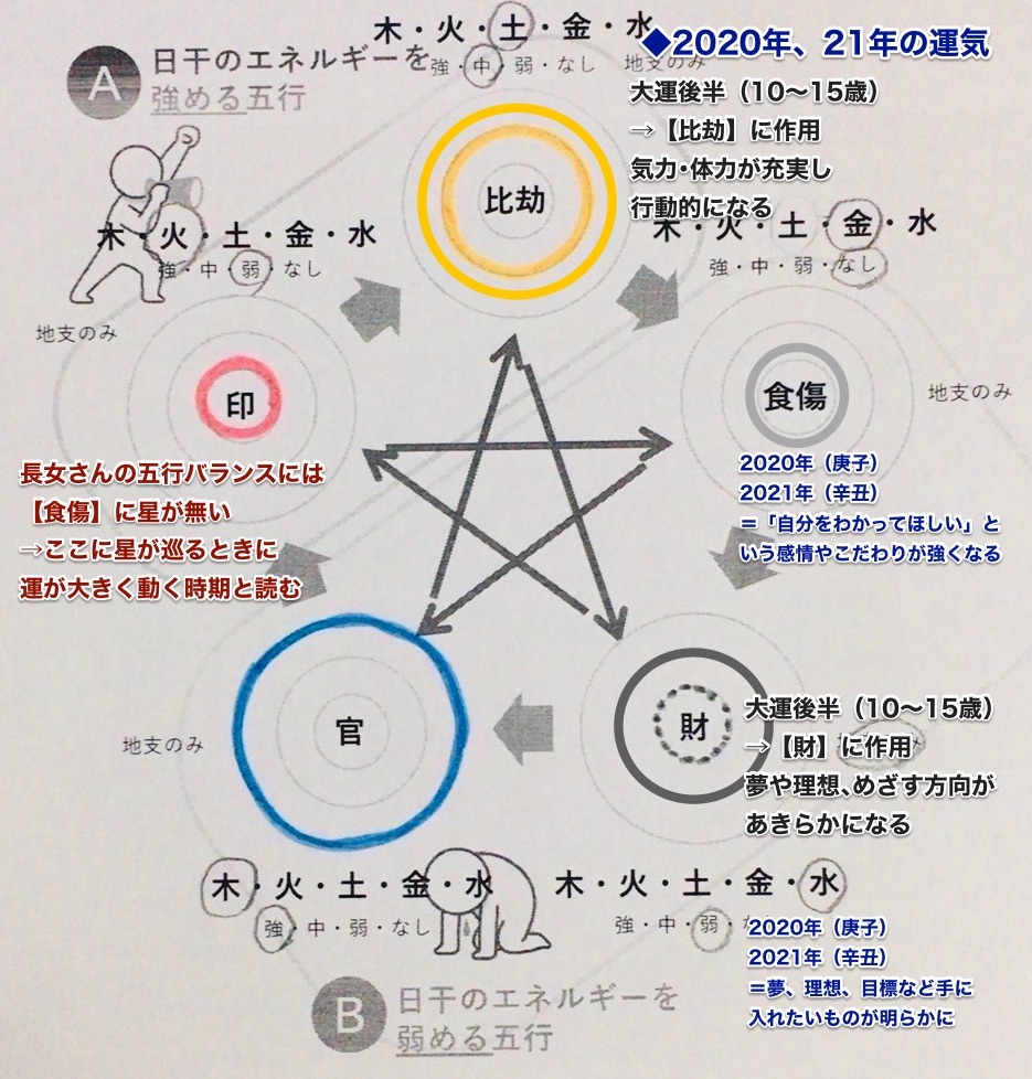 この2年間、びびさんの長女さんの五行バランスでは、金の五行【食傷】と、水の五行【財】に影響が出ます。