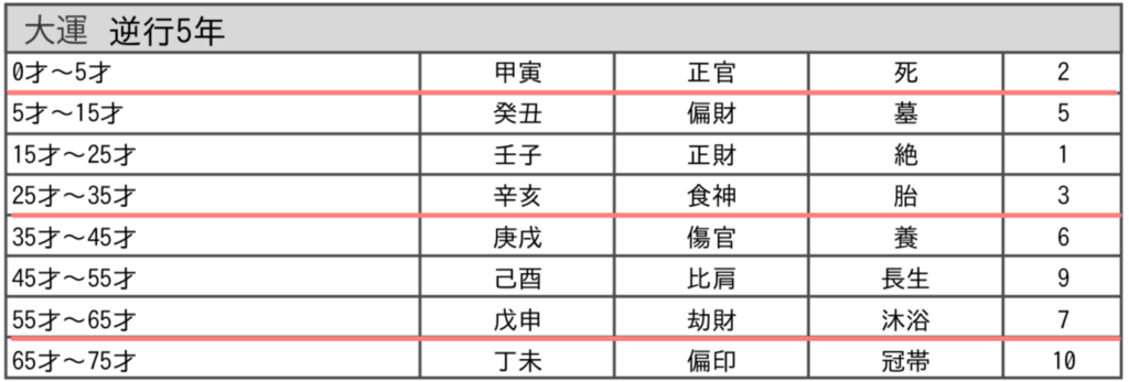 10年周期の社会運を示す大運は、前半の5年間は天干で、後半の5年間は地支で読みます。
