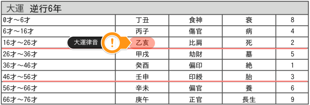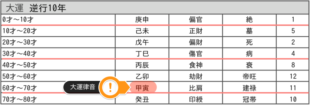 大運律音とは、自分の日柱の干支が大運に巡る状態をいいます。