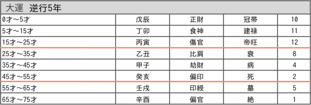 10年周期の社会運を示す大運は、前半の5年間は天干で、後半の5年間は地支で読みます。