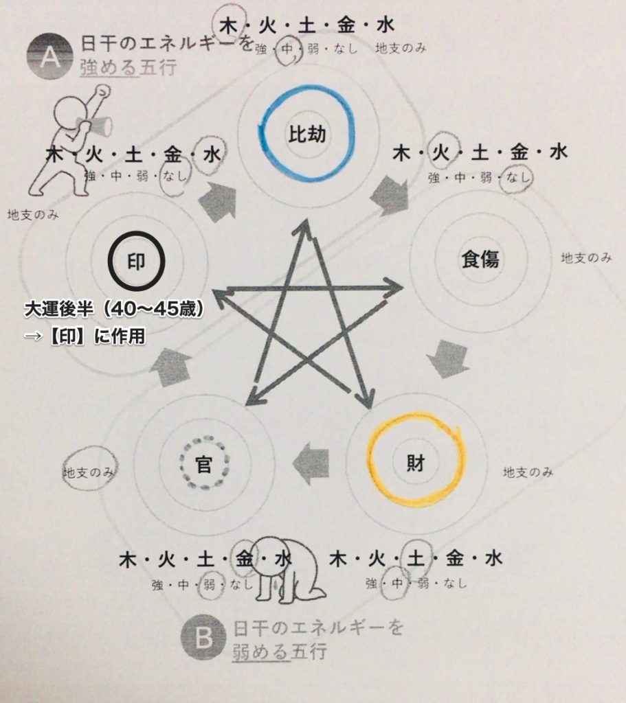 ひろさんの40歳〜45歳前後の5年間は、水の五行(印)に作用が出ます。