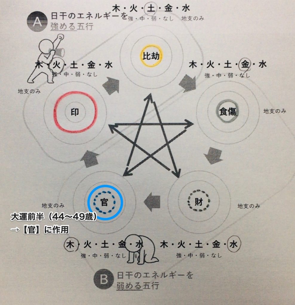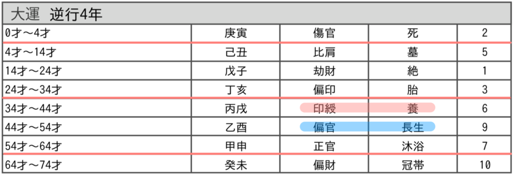 44歳からの10年間、大運に巡る行動の星(偏官)を意識して、どんどん行動を起こしていきましょう。