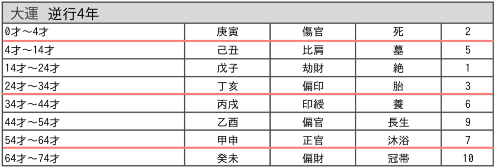 10年周期の社会運を示す大運は、前半の5年間は天干で、後半の5年間は地支で読みます。