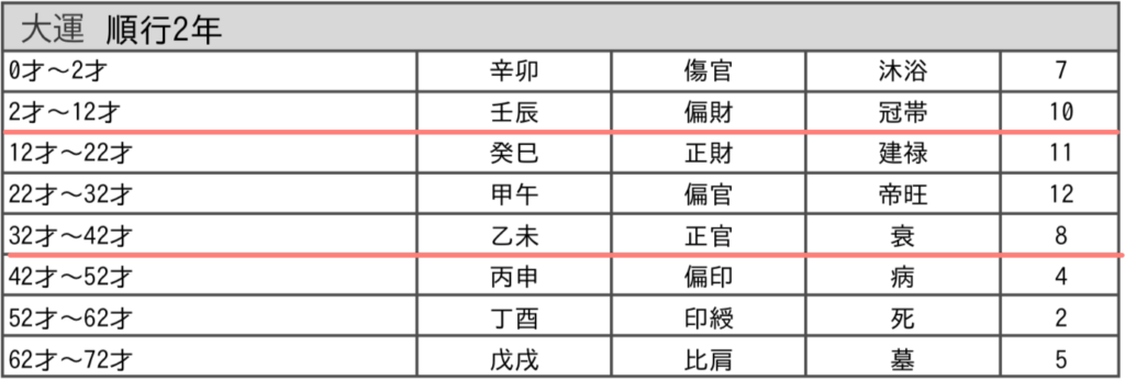 10年周期の社会運を示す大運は、前半の5年間は天干で、後半の5年間は地支で読みます。